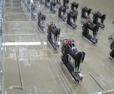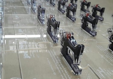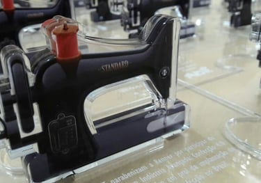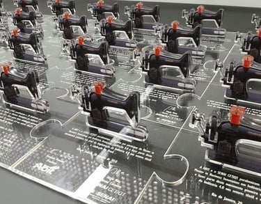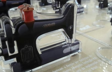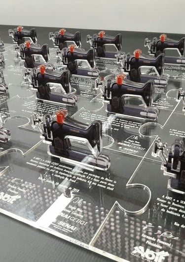 Representação da Máquina de Costura: A figura central de cada troféu é uma miniatura em acrílico da clássica máquina de costura, detalhada em preto com elementos em vermelho para simular botões ou alavancas, capturando a essência da ferramenta fundamental de seu ofício. Esta escolha não é apenas estética, mas profundamente funcional e representativa, honrando a profissão e o talento manual das costureiras. A translucidez do acrílico confere uma modernidade e leveza, permitindo que a luz interaja com a peça.